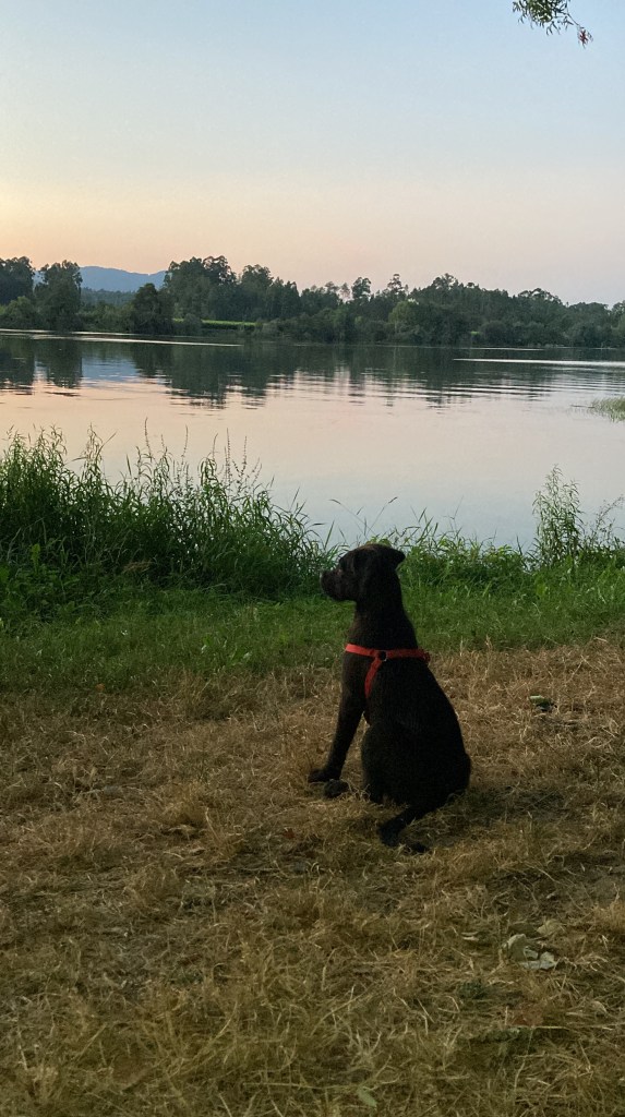 Cuando mi pareja está pasando por momentos de estrés o ansiedad, Aquiles lo percibe de inmediato. Muerde, salta, se inquieta, es increíble y fascinante de ver. Es su manera de decirnos que algo no está bien. Y, muchas veces, es él quien logra sacar a mi pareja de ese bucle emocional. A veces, basta con un paseo por el río, entre pinos y naturaleza, para que los dos se relajen. Veo cómo Aquiles explora, olfatea, corre tras los pájaros y no deja de mirarnos para asegurarse de que seguimos con él. Y veo cómo mi pareja respira mejor, sonríe más, como se convierte en un niño al jugar con Aquiles. En ese entorno, conectamos los tres. Y todo cobra sentido. Me encanta porque a los dos les encanta hacer cosas, siempre tienen que estar haciendo algo, hay que recordarles a los dos que es momento de parar un poco y descansar.
