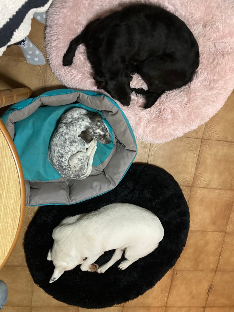Había comprado una cama nueva para Rayo (en mi casa hay 3 perros y 6 camas para ello). La saqué del empaque y la puse en el suelo. Aquiles y Lua no lo pensaron dos veces y se fueron a dormir a nuestra cama. Rayo era tan chiquito que no podía ni subirse. Además, al intentarlo, Aquiles le gruñó para alejarlo y Rayo lo entendió se echó en su nueva cama, que estaba enseguida de nosotros.