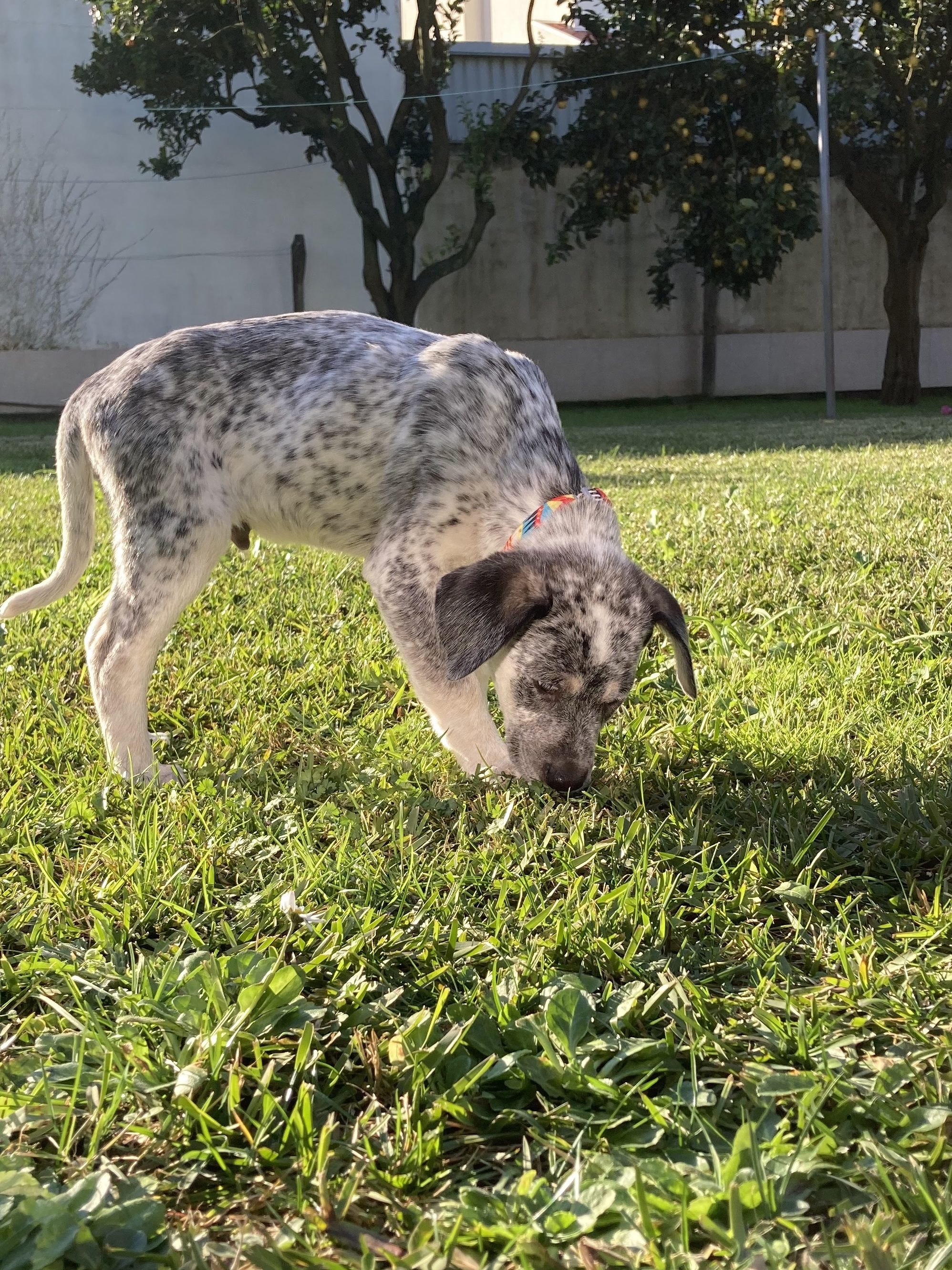 Todo en la vida de Rayito antes de nosotros es bastante dudoso. Estaba en una granja al norte de Galicia. Era parte de una camada de cachorros que regalaban como “dálmatas”, pero ya en las fotos se veía claramente que de dálmatas no tenían nada. Parece ser que era un criadero ilegal, pero no estoy segura de nada, y parece ser que tuvieron algún problema y decidieron recapitular, regalar a los cachorros y operar a las perras y perros para no volver a reproducir ni vender más.